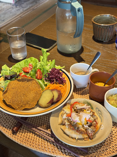 基本的にお庭で取れたお野菜を使っているそうです。 グルテンフリーにも対応。 2種類の沖縄そばは麺をライスヌードルに変更可能(プラス¥100)。 前日までまでの予約になりますが、ヘルシーRAWタコス🌮。米粉ピザもついてとても美味しそうでした!し、頂いた友人が絶賛していました。