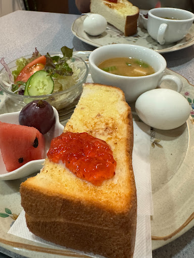 Read moreお昼を軽くすませたくて、近くに来たので初めて寄ってみました。 可愛い黒白猫ちゃんがいました。 お昼だけどモーニング☕️🍞は良いですね! 美味しかったです。 こ綺麗な昔風の喫茶店です。 メロンもついてきましたし、食パンが分厚い!600円でお腹もふくれました、...