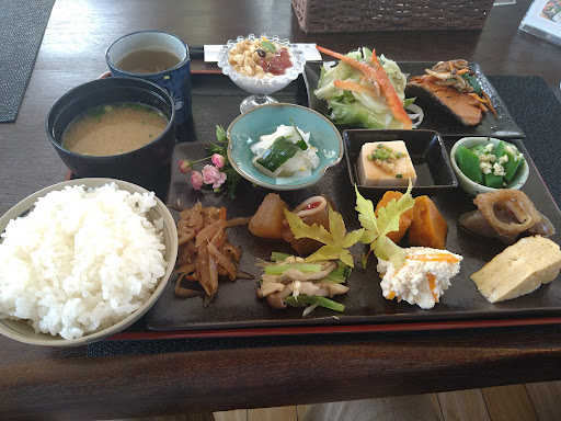 静かで落ち着いた店内の雰囲気。大きな窓からは南国の田園風景が目に入って来ます。女性達の明るくて、落ち着いた接客にも心が和みます。家内は肉が食べれないので、聞いてみると肉をつかわないランチメニューもできるということで安心しました。日替わりランチを注文。主菜を含めて14種類の手造りおかず。すべて、手間暇かけた情が伝わってきました。野菜だけでも、よくかんでゆっくり食べると十分な満腹感がありました。焼肉ランチを食べたあとのけだるい満腹感ではなく、身体が元気になった満腹感と満足感で満たされました。😃 又、...