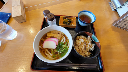 松茸ご飯定食を頂きました🎵ご馳走さまでした。 松茸の香りがフワァ~と…付け合せの高菜の味がキツかったので松茸の香りを楽しんでから食べました💦 うどんの出汁は関東風なのかなぁ? ショウケースの中に並んでるケーキがとても美味しそうでした🎵