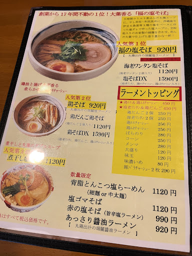 I was recommended a popular local restaurant called Ramen Shinta just a little south in Nanto City. They had a rather large menu of ramen, but for first timers, they recommended their Salt Ramen, but apparently the Chicken Ramen is also popular. Who am I to doubt their recommendations? So I ordered a Shio DX with all the toppings for 1390¥ with deeper broth for 80¥ more. Based on other reviewers, I also ordered a Chicken Nanban for 480¥.