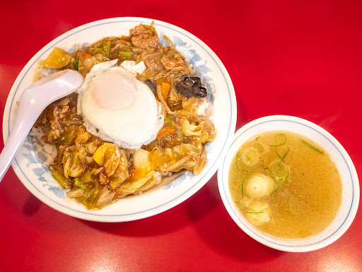 中華丼の類って卵は大抵うずらだと思うのですが、こちらのは目玉焼きがのるがちょっと変わってるという感じです。 あんとご飯が絡み合って美味しいですね。
