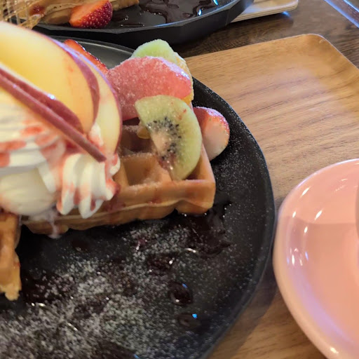 The fluffy waffle fabric was slightly sweet, A few kinds of fruits are brilliantly arranged and overwhelming.