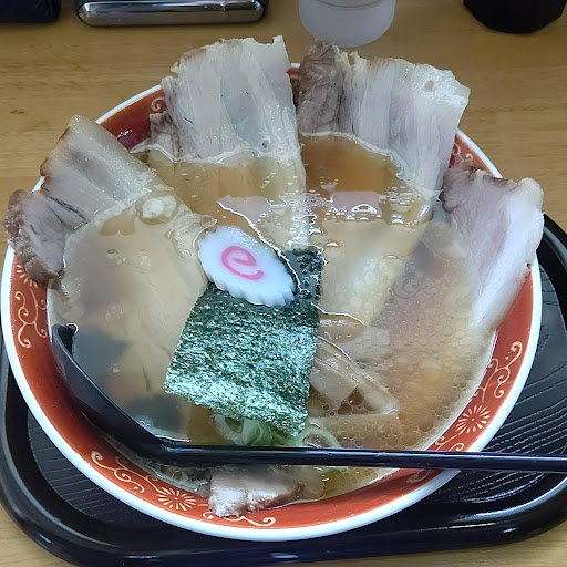 10分弱で到着。チャーシューのインパクトが強いです。10㎝オーバーのバラチャーシューが4枚!ボリューミーです。