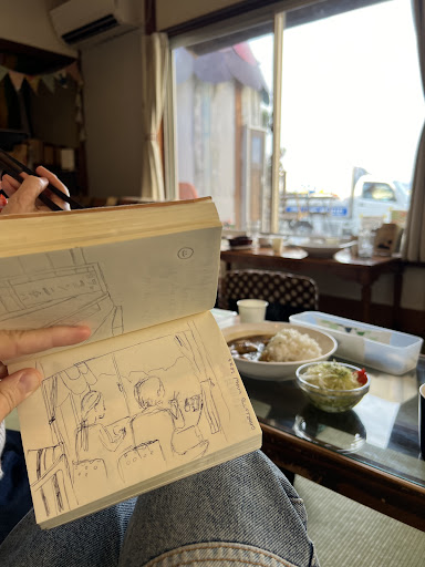 The atmosphere is comfy and cute. I love that you take your shoes off at the door. We ate with a view of the sea and the fishing boats. If you explore the space you will find cute mini-artworks and recommendations for the island. I found this booklet where people leave notes and drawings. I left a drawing of the space and...