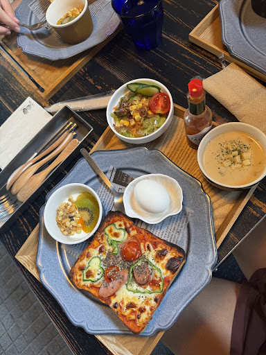 Their breakfast options are set meals. You can choose either a thick Japanese-style toast (simple or with a topping) or a huge fruit and yogurt bowl. Most set meals can come with a small yogurt bowl, a small soup, a small salad, a boiled egg, and a drink (you can choose to include all this or just a few).