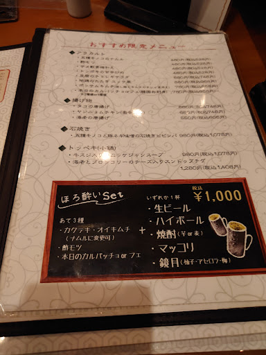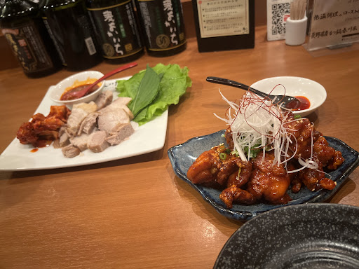 ディナータイムなので「ワンドリンクの注文をしてください」(これはよくあることなので仕方ないか)出てきた美酢は薄い💧 春川タッカルビ鍋の説明を小声でする女性スタッフに、「聞こえません」と言うとムッとして少しボリュームを上げて早口で説明されました。結局何を伝えたかったか分からず💧 タッカルビ鍋は辛くて濃い。 キムチはヤンニョムのコクは全く無しの砂糖甘くて辛い赤い食べ物でした。 チャプチェは野菜がほとんどない茶色い春雨。 イカチヂミを頼んだけどイカはどこ?? 極めつけはお茶。「お茶貰えますか?」「コーン茶ならあります」と出てきたものは湯呑みに半分以下で、薄くてコーンの香りは遠くにありました。おかわりを頼むと「コーン茶は一人一杯です」と。水も貰えませんでした。