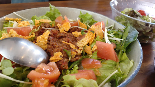 Read more土曜日の13時30分頃に訪問。テーブル席とカウンターがいっぱいで、空いていた奥のソファー席に案内いただきました。オーダーは週替わりランチとミートライスとご主人さんに伝えて、セルフの水を汲みにいく。大きい窓から入るひかりで明るい店内、観葉植物がたくさん配置され、窓の向こうにはオリーブやユーカリが風に揺れていました。雰囲気が良くて落ち着くお店てます。気付くと周りは子ども用の絵本が本棚にたくさん並び、お子さま連れの家族で満席でした。 しばらくでテーブルに並んだランチは、美味しくて健康的、ボリュームとちょうどです。小さい子が一緒でも安心していられるし、ゆっくりできるいいお店です。 駐車場は店前に4台停められます。滞在中にも予約の電話が入っていたので、来店前には確認したほう...