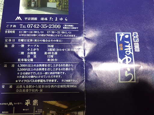 Read more法事で 利用しました! 何時も利用するお店が 早くから埋まって 柿の葉寿司 平宗別館 倭膳 たまゆらで決めました お店の前の道は良く通りまが中に入った事は1度も無かったけど,平宗のネームバリューが有り 全然心配はして無い!