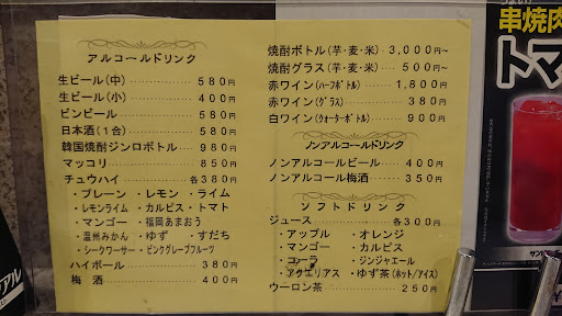 ・キムチ盛り合わせ 880円 ・バラ 260円 ・ウインナー 130円 ・ロース 260円 ・タン 200円 ・霧島豚カルピ 180円 ・地鶏の皮 180円 ・赤千枚 180円 ・上ミノ 240円 ・鉄板ピビンバ...