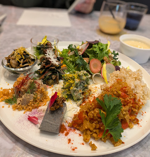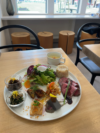H&Bプレートを注文しました。野菜だけでなく、肉も入っています。 提供までには20分くらいかかりました。 本日のヴィーガンポタージュは、春キャベツを使い、豆乳と味噌で味付けしています。 ローストビーフ、旬の野菜サラダと自家製ドレッシング、玄米。惣菜は切り干し大根とパプリカのマリネ、黒胡麻の寒天寄せ、フリッタータなど6種です。 ローストビーフは、柔らかくて肉の旨味が凝縮されていて感動の美味しさでした。 自家製ドレッシングも気に入りました。 どの惣菜も、しっかり味はついています。