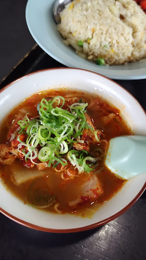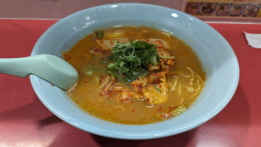 旭川ラーメンに詳しくないが、スタミナラーメンが看板メニューか。 年季の入ったような雰囲気のラーメン店。色彩が派手で傍目から目を引くラーメン屋。 店内はテーブルとカウンターがあり、席数は思ったよりも多く、駐車スペースも10台ほどある。 お水はセルフサービス。テレビが流れていて、畳のようなにおいも相まって昔懐かしい雰囲気。 厨房からは中華鍋をふるっている音が心地よく、古くからの町中華といった雰囲気。 スタミナラーメンが看板メニューのようで、個人的にみそラーメンが好みなので、みそスタミナラーメンの中をオーダー。麺の量が通常よりも多めのようだ。中を頼んだが1.5玉とある。子供はみそラーメンの小と、醤油ラーメンのミニを注文。子連れにはミニサーズがあるのはありがたい。 チャーハンも注文した。チャーハンは良い意味で手作り感を感じられる素朴な味わいで、玉ねぎが想像以上に大き目のカットされていて、食感よく、個人的にはあり。 10分程で着丼。見た目は予想通りのスタミナラーメンの様相。みその香りと辛味が相まって食欲をそそる。 麺は中細、ストレートか縮れかよくわからなかったが、コシのあるしっかりとした卵麺。 スープを一口。豚骨をベースとしたスープにみその深みや旨味が加わった旨いスープ。にんにくが良い。酸味の効いたピリッとしたアクセントがみそとも相まって絶妙。塩加減は本家と比較して控え目で、個人的には好み。チャーシュー以外に痛めた豚肉がトッピングされている。豚キムチがトッピングされているようなイメージ。キムチは非常にあっさりしたものを使用しているようで、必要以上に主張せず好感をもった。白菜のしゃきしゃきが良い。 全体的に非常によくできている。チャーシューは薄めにカットされているが、豚の旨味をしっかりと感じられる。 スープは完飲したいほどだったが、飲みきるには塩分がつよいか。ごはんをダイブさせるな...