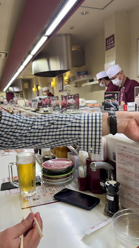 There is a very long conveyor belt, i mean its probably the longest ive ever seen and ive been to a few around the world and nothing beats this so far. With dozens of tiny stools to sit at the counter watching the staff prepare hundreds more sushi items for the belt as customers are whipping them off very fast to devour.