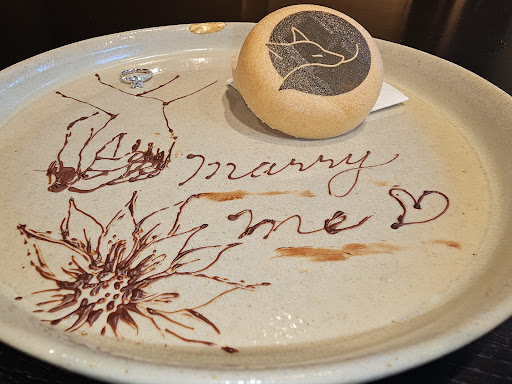 This was a lunch after a proposal in Nara. She surprised us with a decorated plate to remember on the last course of dessert! You can most likely ask for a surprise plate design for any occasion like they advertise before hand when you arrive. We were very happy with our first wonderful delicious sukiyaki meal and the excellent service provided by our host/chef.