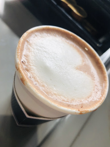 テイクアウト仕様のホットカップに厚紙の帯。 蓋の上には個包装されたマシュマロ がのせられて提供です。