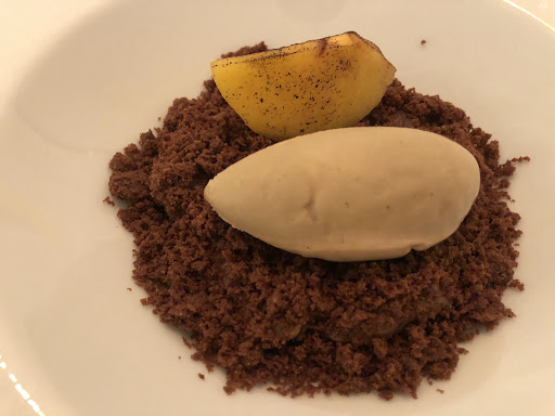 前菜 低温調理された秋刀魚の上にミョウガなどの薬味をシェリーで和えたもの、下にはなすのピューレ。前菜が一番美味しかった。 食べ慣れた秋のごちそうである秋刀魚と焼きナスが、見事にフレンチに。特になすのピューレはだしの香りとややスモーキーさもあり、さながら焼きナスであった。秋刀魚の脂身もくどくなく、本当に美味しかった。