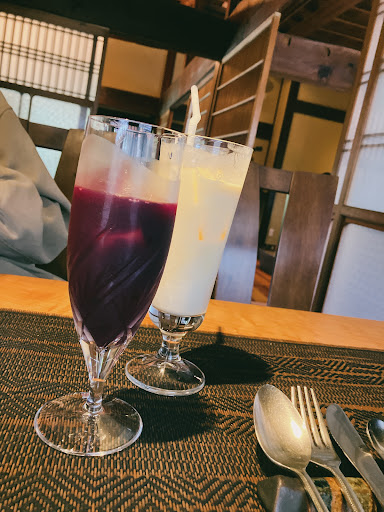 古民家でイスとテーブル(座敷ではない)のレストラン。 これ猫師が大好きなパターンなのでこの時点でわくわく感が止まらない、笑