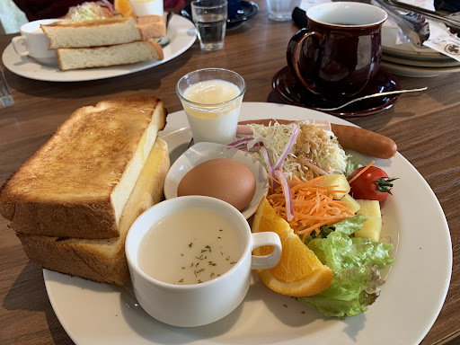Read more店に入って案内パネルに人数とスマホの番号を入力。車でTVを見ながら待つこと10分、通知が来たので店内へ。 テーブルに案内され、ブレンドコーヒーとリッチモーニングセットを注文。ゆで卵、ソーセージ、スープ、サラダにヨーグルトが付いて、焼き立てパンとバタートーストは食べ放題です。バタートーストはほんのりとした甘みがあり美味しかったので、...