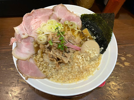 毎週金曜日から提供開始され、材料がなくなり次第販売終了となる創作限定。こちらもまたこのお店のもうひとつの名物と言えます。 2024年1月19日から販売されていたのが上記のメニュー。濃厚スープばかりが語られるお店ですが、実はあっさりの清湯も極上のお味です。 名古屋コーチンを軸にした穏やかな鶏清湯と香り良い醤油が一体となった上質なスープは、澄み切った味わいながら奥行きは深く、グイグイと引き込まれます。 丸鶏や昆布、野菜等も使用されており、柔らかな出汁感の中にも強い旨味を感じ取ることができます。 張りのある中細麺を啜れば、持ち上げるスープとの相性の良さ、雰囲気から、どこか懐かしい中華そばの雰囲気を感じ取れたり。 中央に配された熊本のブランド豚「あそび豚」のバラスライスは甘辛くしぐれ煮風に味付けられています。その柔らかで上品な肉質は格別でした。 他にはイカ粉を絡めた天かすや瑞々しいネギ等、味に香りにこれでもかと工夫が凝らされており、十分に満足できる一杯でした。
