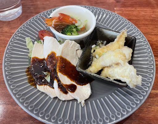 ⚫︎前菜 これ、いいですね!! 蒸し鶏の味噌がけ、鶏と白身魚の揚げもの、甘海老の葱ソースかけでした。 蒸し鶏の味噌は非常に辛く、これだけでも結構お腹にきます。 揚げものは、本当にサクサクっとして特に白身魚が美味しかったです。 ⚫︎点心2種 皮がしっかり目の小籠包風とサクサクっとした魚介系のツミレが入った揚げものでした。 丁寧に調理されているものでした。 ⚫︎汁なし担々麺 事前情報では旨辛いとか辛さはそれほどって書き込みがありましたが、最初の一口目だけマイルドで後からジワーッと辛さと痺れが効いてきました。辛さ2に対して痺れ1くらいの感じで絶妙な割合でした! ものすごくご飯に合うのですが、自分には辛すぎましたが非常に旨味もありました。 非常にグレードの高い汁なし担々麺でした。 ⚫︎ライス おかわり自由です。 本来なら汁なし担々麺にたっぷり入ったタレでおかわりすべきですが、辛さでお腹が膨れギブアップ。 男性ならお代わりしていた方が多かったです。 ⚫︎スープ 卵と野菜のスープです。 多くの店で手を抜かれることが多い中、ホテルの中華並みにきちんと調理されているスープでした。 美味しかったですし、お代わりできます。 ⚫︎杏仁豆腐 これ、絶品でした! ものすごく滑らかで、量も十分一人前ありました。 レモン汁をかけていただくのですが、爽やかも加わり最後の一品に相応しいものでした。