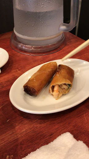 五目春巻きを... ちょっと揚げ感が強めのパリパリ皮。 オイスターソース系のうまみが効いた具材。 オーソドックスな感じです。