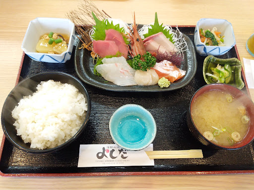 Read more竜田駅の目の前にあります。 駐車場は店舗前に5~6台、店舗裏の砂利駐に12~3台くらいは置けるかな?と思います。 海鮮が美味しいとの口コミで、なかなかこの辺りで美味しい海鮮が食べられるのは珍しいなと行ってみました。 店舗はまだ新しく、明るく清潔感があります。 12時前に到着しましたがほぼ満席。その後も次々来店ありました。 隣のお店が臨時休業だったせいもあるかも?にしても人気店なのをうかがわせます。 席はカウンター6席、2人がけテーブルが6席くらいと4人がけが2席。 とは言えセパレートになるテーブルなので、人数によってくっつけたり離したり出来るようです。 店内はかなり狭いですがそんなにキツキツな感じもしないです。 本日オススメの中から鰹とカンパチの2点盛りの定食にしました。 正直、鰹もカンパチも普通です。評判ほどでは無いかなぁ…… 刺身がとにかく切り身かなってくらい分厚くて食べづらい。 変な臭みは全くないので活きは悪くないんですが、ちょっと良さげなスーパーとかで買ってきた刺身な感じです。 悪くは無いし、お値段も相応でしたので文句はありませんが、刺身系のリピはないです。 刺身より天ぷらの方がいいかもしれない。 店員さんは皆さん明るく笑顔、親切で素晴らしい接客で...