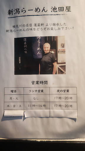 Read more2021.1.16時点で旧習志野トラックステーションから移転の池田屋さんは、現在の新潟ラーメン家池田屋さんと、高速道路近くにある和食料理店ワダチさんとに分かれています。 池田屋さんの新潟ラーメンは新検見川にあった蓬来軒さんの味を正式に継承しているそうです。 完全に私の偏見での評価となりますが、蓬来軒さんを何度か頂いた事のある自分の結論としては、「あっさりラーメンなだけで、蓬来軒さんを楽しみにして食べられなかった職場の同僚には紹介しない。」です。 その前に営業日について、店頭で見つけられなかったので他者の優秀なブログより、木金土の昼夜、月火の夜だそうです。あくまで通常の営業日です。 さて中身なのですが、蓬来軒さんは魚介出汁(メインはうるめイワシだそう。)を使用したあっさり醤油ラーメン(塩のように透明)で、もちろん池田屋さんも同様の出汁かと思い伺いました。 最初にチャーシュー麺を頂きましたが完全にチャーシューに負けて鶏ガラ等の出汁が口いっぱいに広がり、肝心の魚介の香りが感じられませんでした。 チャーシューに負けたものだと思い込み、後日改めて普通の「ラーメン」を頂きに再訪しました。 チャーシュー麺より幾分かましではありましたが、魚介の香り自体がやはり弱く、麺を口に含んだ時に魚介出汁の香りが消えて麺の瑞々しい食感と動物系の出汁が前面に出てきます。 何度も書きますが蓬来軒さんは狭かったせいもあり入店の瞬間から魚介出汁の香りが充満し、口に含んだ時も麺などに負けず、しかし臭みがあるわけでもない不思議と魅力のある味でしたが、こちらの池田屋さんの魚介出汁は静かで具材や麺に負ける程静かです。鶏ガラ等の動物系メインと思った方がいいあっさり醤油ラーメンです。 ですが全く出汁と具材の調和がないわけでもないので、興味がある方は一度食べてみて下さい。 もう一度書きますが、私は蓬来軒さんを楽しみにしていた同僚には進めません。かと言って蓬来軒さんを知らないラーメン好きの同僚にも特に進めないつもりです。 ちなみに蓬来軒さんはチャーシュー麺とラーメンのチャーシューは別物としていたはずで、新潟ラーメンは幾つか種類があり特定の種類を指...