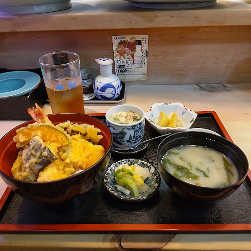 ランチのみでの評価です。 二時までやっているランチメニューが外に出ており大好きな天丼!しかも800円⁉️ あけぼので弁当買ってたが…たまらず来店。 店内見えないので少し入店しにくいが大将が迎えてくれました。立派な生け簀があります。カウンターにて天丼を! 冷たいお茶を大きいカップで提供は有難い。 大将の魚捌きを見ながら暫ししてから提供。お米の量聞かれたので増やして貰いました笑