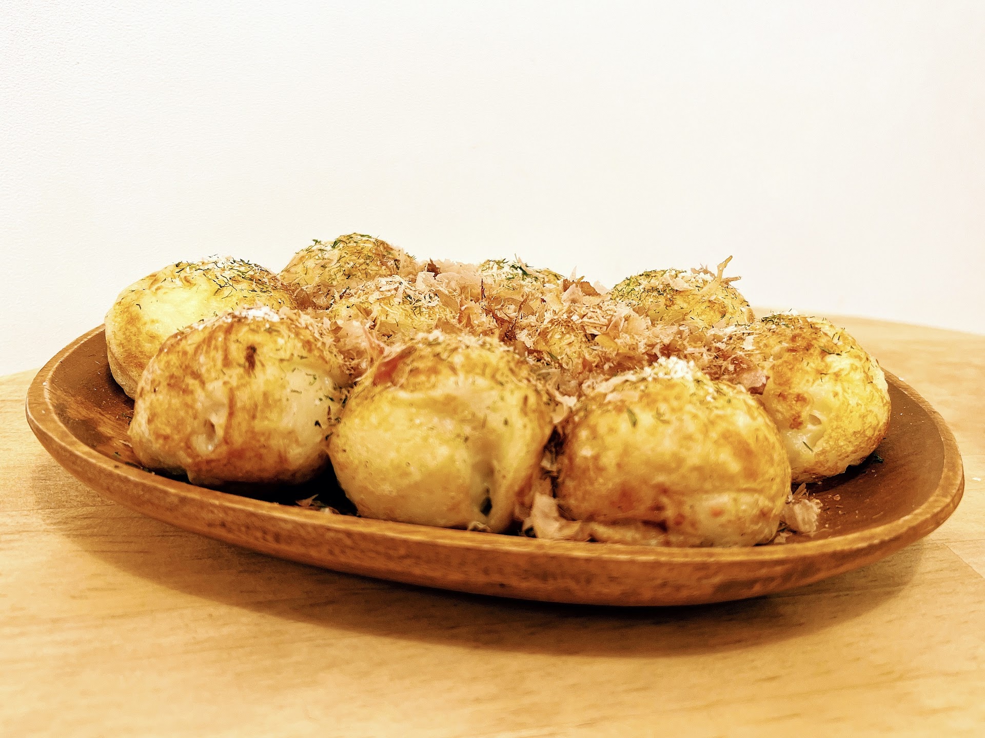 出来上がったたこ焼きは1個が大きめなサイズでボリュームがあります 生地は外がフワフワで弾力があり、中はモチモチしていて軽くトロけます しっかりと生地の旨みを食べさせてくれるたこ焼きで出汁と玉子と小麦の風味が塩とわさびで更に旨みを引き立ててくれている感じでした