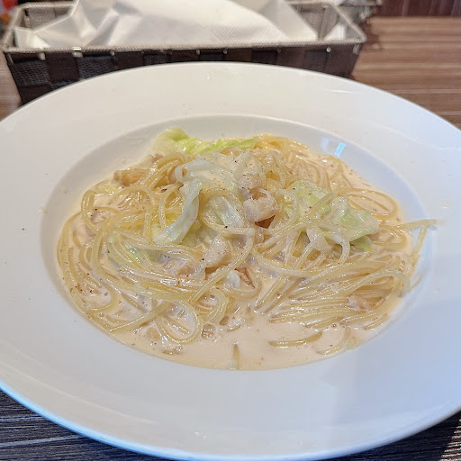 限定の生パスタはすでに無くて 普通のスパゲティーニでつくってもらったんだけど 白味噌のソースがおいしかった!!