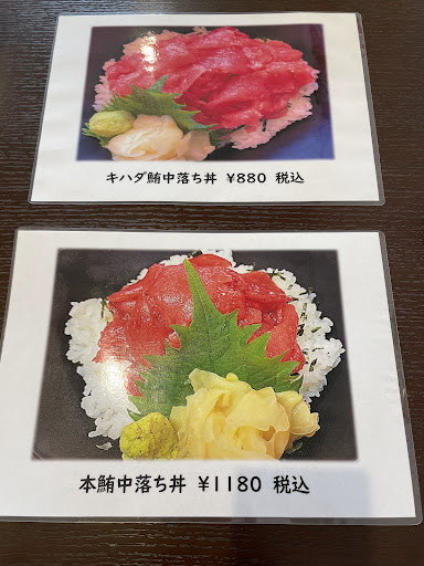 平日11時の開店と同時に入店、3組ほど先客あり、噂通り店内はマグロ愛で満たされた空間です、メニューはマグロを中心にサーモンなども提供されています、驚くべきことに注文から5分待たずスピード提供です、本日は看板メニューの「本鮪中落ち丼」と「成田丼」をいただきました
