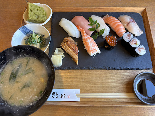 《2023/10/14(土)》 通勤路の道中で前から気になってたお寿司屋さんに初訪問🍣 今日は、昼メニューの"にぎり定食(税込1400円)"をオーダー。ネタはどれも新鮮で臭みもなく、お汁もサッパリした味付けで小さなデザートもついてます。お値段以上の価値は間違いなし👍 お寿司は大将1人で握ってるようなので混雑時は待ち時間が少々ありますが、お仕事は丁寧なので私は気になりません。 ご夫婦でされてる温かい感じでお洒落な雰囲気がNICEな"鮨よし"さん。 今日も美味しくご馳走様でした😋💯👍👍
