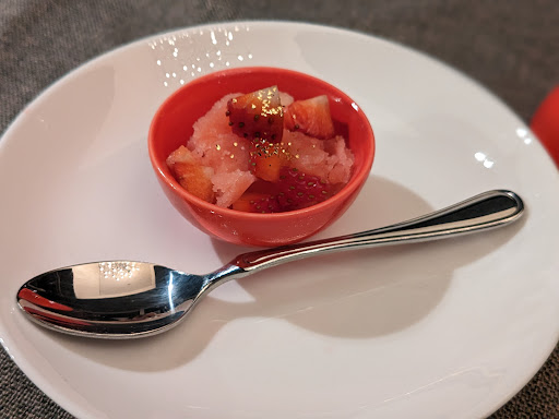 苺のグラニテを挟んで肉のメイン、阿波黒毛和牛ヒレ肉のグラチネ。鯛のムースでも効いていたが、ここでもトリュフがふんだんに。コクのあるマデラソースで上質な仕上がりになっている。量も多すぎず個人的にはこのくらいがちょうど良い。