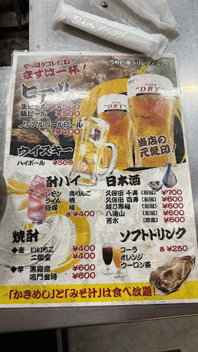 酒類やジュースもサイドメニューでありました。 店の前に牡蠣の生簀、店の中にエビやホタテ、貝類の生簀があって、どうやら牡蠣蒸す前に買ったら一緒に鉄板に放り込んで調理してもらえるようです。