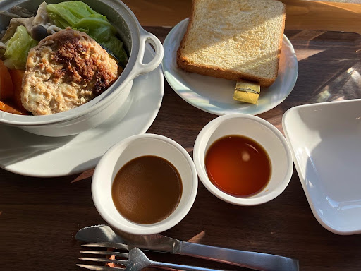 Read more那須町の旧朝日小の再利用施設の中にあります。 入り口が共通なので分かりづらいですが、手前から入るとあや市場の手前にあります。 しっかりしたキッチンがあって、ちゃんとした食事ができます。しかも那須にしてはリーズナブルです。 この日は蒸しハンバーグ定職を頂きました。ハンバーグは焼いたものが野菜と一緒に蒸されていました。野菜たっぷりで美味しかったです。 パンとライスが選べたのでパンにしましたが、これも美味しかったですね。 2時を過ぎていましたが、ランチが食べられてよかったです。近くに山小屋があ...