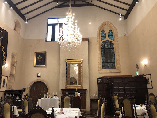 ここは結婚式場のミッシェルガーデンコートの中にあるレストラン。英国貴族の館・マナーハウスを建築技法から細部まで再現した建物は、建物のみならず、アンティークな家具やシャンデリア、絵画まで本物にこだわっています。