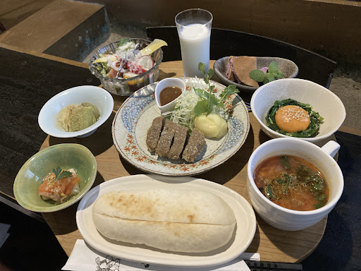 パンだと軽すぎるかなと思いましたが、米粉のパンなので、お餅のようなもっちり感があり、牛カツをパンに挟んでカツサンドにするとボリュームがあり、柔らかい牛カツをとパンの相性がバッチリ👌でした! 他の小鉢もどれも美味しくて、本当に満足です!