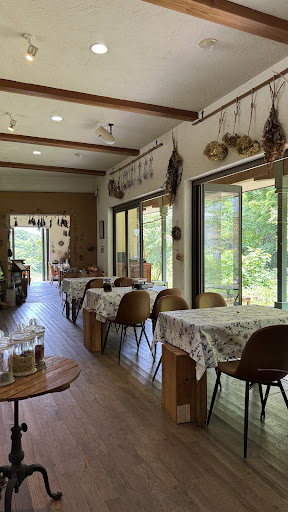 Read moreハーブには詳しくないので特にコメントしませんが、カフェとして秀逸です。目の前に自然の広がる景色が美しく、通り抜ける風が気持ちいい。店の外にはさまざまなハーブが繁り、軒先では収穫したハーブが干されている、店の中に目を転じると加工された多種多様なハーブが綺麗にパッケージされて販売されています。壁には売り物でないドライフラワーになったハーブが飾られ、えも言われない豊かで落ち着いた空間を作っています。室内でもお茶をいただけるけれど、軒下は庭に触れるほど近く、蝶々が飛んできたりして時間の経つのを忘れます。いただいた2種類のお茶にはさまざまなハーブが入って、体に優しく、いつまでも飲んでいられます。のんびりと豊か...