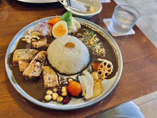#メニュー ●しらさぎ邸特製黒カレー 見た目からも美しいスパイシーなカレー。ホロホロに煮込んだ牛肉と野菜もたっぷりと添えられています。カレーのルーには、隠し味としてイカ墨が使用されているそうです。 スパイスには深みがあり、奥行きのあるルー。こだわりの感じられる最幸の一品です。 味変にグラナパダーノ※チーズを提供されます。コクがさらに深まります。