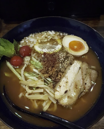 「とまとらーめん」は程よい酸味と果肉入りでニンニクの効いてるスープにセロリ味玉チャーシューがのっていました。期間限定メニューです。