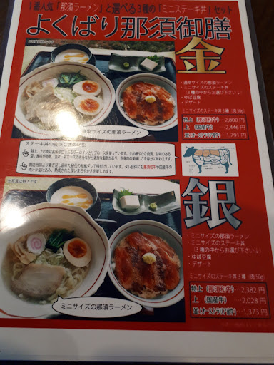 Read more那須湯本の日帰り温泉に行った際に初訪問。 お目当ては『じとじとラーメン』。 何なんだ?じとじとって… 塩原温泉に行くときに、看板見てずっと気になっていました。 注文は、私がじとじとラーメン(醤油)、家内が銀セット(半那須ラーメン(塩)+半ステーキ丼(那須和牛)+湯葉豆腐+杏仁豆腐)。 じとじとラーメン醤油は、背脂浮いてますが思ったよりクドくなくスープ美味しいです。麺は縮れていて、チャーシュー美味しいです。 半那須ラーメン塩は、ちょっと味濃かったですね。じとじと、那須御養卵の味玉、チャーシュー、野菜が載っています。個人的には醤油の方が好きですね。 半ステーキ丼(那須和牛)は、お肉が柔らかく脂身も甘く上品な味でした。タレも美味しかったです。炒めた玉ねぎがアクセントになっています。 ご馳走様でした。また来ます。...