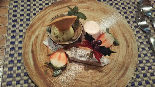 付け合わせのお野菜も素揚げや米粉が付いていて美味しかったし びっくりしたのが柿の揚げ物。 フルーティで甘くて口の中でとろけました。