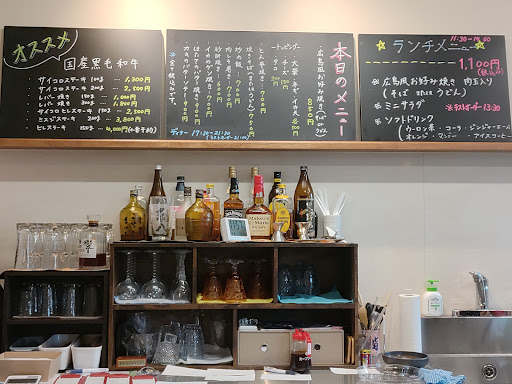 那須塩原で見つけた、広島風お好み焼き屋さんです! 那須塩原駅から徒歩12分位でしょうか、割烹店の様な綺麗な店構えです。 常連さんらしきお客が2名鉄板前のカウンターで飲んでいました。 やはり、広島お好み焼きをメインにオーダー♫ 女将が目の前で焼きます!料理は焼き立てをつまむ感じです。 先ず調理時間が必要なお好み焼きから山盛りのキャベツに薄力生地をかけ、押さえ焼き、時間を置きます! そこからとんぺい焼き、牛レバー、サイコロステーキ、カキのバターソテーの焼き焼き開始! 時期では無いカキは別としても特筆すべきは肉質が良い、那須市で食べた牛肉では一番美味しい、レバーは生でも行けるレベルでした。