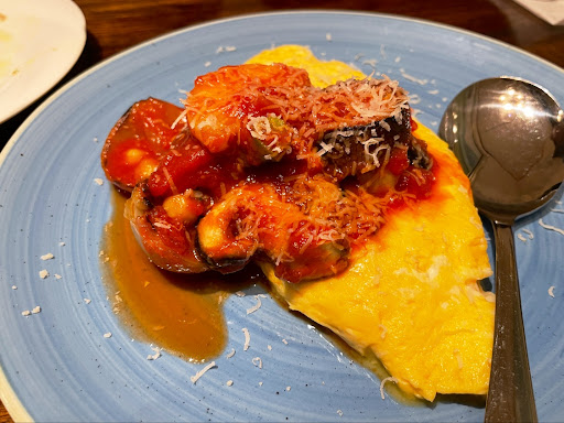 息子がオーダーしたオムライス、クドくなくとても美味しいとの感想。 妻がオーダーしたジェノベーゼのパスタは野菜とエビがゴロゴロ入っていて賑やかな盛り付け。ただ、パスタが自家製なのか、モチモチした食感で好みではなかったとの感想。私も味見したけど、パスタのモチモチ食感は合わないかな。歯触りが良くない。