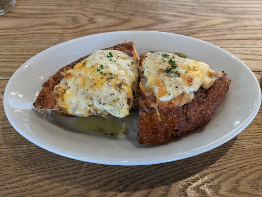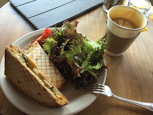 悪いところ、先ずは店舗だ。あの地域は古い家屋が並ぶ商店であったとのこと。その面影は微塵もなく、天井の梁のみが残っていた。気になったのはその梁を利用するでなく、鉄骨で押し上げていた。梁の接合部は外れ歪んでいた。。建物をどうしようと所有者の勝手だが、数少ない貴重な建物が勿体無いと痛々しい思いになった… 料理も4.4という高得点には届かない。メニューは少なく、モーニングとしては少し物足りない。どちらかと言うと小腹を満たすカフェという位置づけだろうか。味も美味しいが、また訪れたいと強く思えるほど印象的ではない。薄味と言うわけではないが、輪郭がぼやけていると感じた。写真はチャパターに似たパンでホワイトソースを挟み、上にチーズを乗せて焼いたものだ。ホワイトソースとチーズは塩味が少なく、比較的味の傾向が似ている。パン自体に味が着いているわけではないので、少し物足りない。夏の炎天下で体が塩分を欲していたためそう感じた可能性は否定しきれないが。 椅子も座り心地よりデザイン重視で座りやすいとは言い難かった。