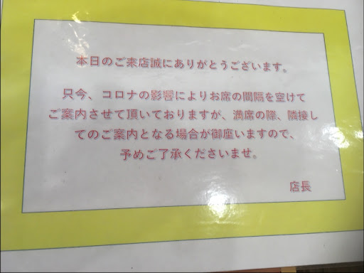 2020年11月頃 ・バックヤードに置いた方が良いもの(汚れた食器、ワサビのストックなど)を、客の目につくところに置いている。 ・このご時世に、子供用の椅子を床に置いている。 ・注文品が来るのが、他店に比べて遅い。 ・席は空いているが店員が足りてない気がする。 ・茶碗蒸しは蓋なし(現在は蓋なし提供と言われた、コロナ禍にあえて?)、ラーメンはレンゲなし(タッチパネルで頼めそうだった)で提供 ・画像のような注意書きが、席に置いてあった。席の間隔はコロナ対策で空けてるけど、混んでる時は空けないとのこと。対応が一貫していないので、こんな注意書きは必要ないと思う。 ・女性の店員さんたちの対応は良いので、上記の問題点は、店舗の上部の方々が原因ではと考察。 ・普段は近所の競合店に行くが、今後も競合...