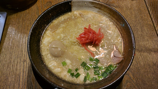 この日は(と言うか、ほぼ毎回ですが…)チーズマヨとんこつラーメンを頂きました。 正直言いますと「これは滅茶苦茶旨~い!!!」という物凄い感動はなく、「普通に旨いラーメン」と言う印象ですが、チーズとマヨのコクが舌の奥で否応なく感じられるスープが癖になり、定期的に食べたくなる中毒性の強いラーメンですね。コクのあまり感じられないラーメンでも美味しいラーメンはいくらでもありますが、そういったラーメンは中毒性はなく、一回行ったら飽きてしまうことも多いのですが、ここのチーズマヨとんこつは食べる側の心理をよく考えられたラーメンと感じます。そういう意味では、忘れた頃にここのチーズマヨとんこつ、また食べたいなぁ…と思ってしまうところがとても不思議な魅力のあるラーメンですね。始めはラーメンにマヨネーズって…と思ったのも事実ですが、その味にはすっかりハマってしまっています。気軽に行ける場所ではありませんが、今後も何度も通る道なので、また機会があればリ...