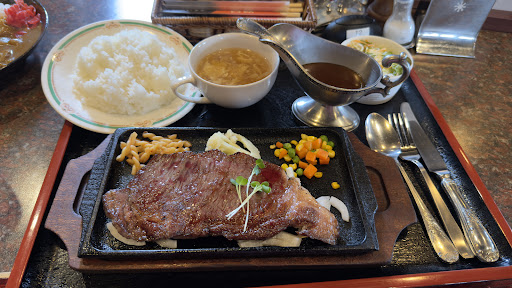 とても気になっていた栃木のブランド和牛、後藤牛のステーキが食べられるお店と聞いてお邪魔しました。サーロインステーキとせっかくなのでカレーも注文させていただきました。 ステーキの感想は、指定の焼き加減がイメージ通りの焼き加減でとても良く、バランスの良いサシの入ったお肉がとても柔らかくて、脂はなかなか甘味があり美味しいです。お肉に臭みなどはほとんど感じずいい脂の香りがして、赤身肉のステーキとは違ったジューシー感や柔らかさがとても良いです。サシの脂はそれほどくどい感じもせず、すっきりとした脂といった印象。普段はあまり脂身の部分は食べずに残してしまいますが、脂がすっきりとして甘味がある肉だったので、脂身も綺麗に食べ切ることができました。脂身独特のプリっとした食感も少なく柔らかくて美味しかったです。そういえば、サーロイン独特の赤身と脂身の間の筋の部分がかなり薄く柔らかかったので、全体を通してストレスを感じずに全部分を美味しくいただける、とても良いお肉でした。 次にカレーですが、ベースのカレーは中辛かちょっと辛口な感じで、レストランのカレーといったイメージよりはちょっぴり家庭的な味の印象。具材はかなりシンプルで玉ねぎと肉で勝負といった感じ。お肉は和牛のサシを感じるお肉と、おそらく煮込んだスネ肉がゴロゴロ入っていました。スネ肉の方は歯応えがありつつもしっかり噛めばほぐれる感じで、和牛の方は割とゴロゴロしているのにホロホロと溶けていなくなってしまう贅沢な感じがしました。カレーの味も好みの味で、お肉がたくさん入ってボリュームがあったので、とて...