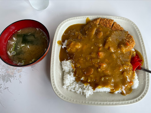 肝心の料理ですが、 カレーは家庭的な感じでゴトゴトしていて、甘めの味付けです。 カツは事前に揚げていたもののようで、揚げたてではありませんでした。 ご飯の量は普通かな。 味噌汁は業務用インスタントな味。