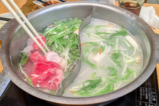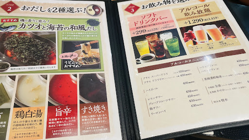 Read more日曜日のお昼ちょっと前に伺いました。 いつも混んでいる印象でしたがガラガラでした。 これは何かやらかして客がいないのかな~やっちまったかな~などと思いながら席に案内され、丁寧にプランややり方の説明を聞く。 色々なプランがあるが、シンプルな豚ロース&バラのプランにした。 寿司はここで食べなくともよいと思っていたので、意外と安いプランでコスパ良し。 だし汁は昆布だしと旨辛だしのチョイス。 肉は最初にテーブルに持ってきていただき、その後は呼び出しブザーで追加する方式。 その他野菜や付けダレはビュッフェ方式で取りに行く形です。 野菜やキノコも色々な種類がありましたが、ネギが緑の部分や分け目が多く今一つ。 付けダレはシンプルにポン酢とゴマダレをチョイス。 そうこうしている内に鍋の出汁が沸騰してきましたので、豪快に野菜やら肉を投げ込みます。 肉は薄めですがおいしい。 野菜も出汁を吸っておいしい。 つくねは竹状の入れ物から自分で分量を決めて鍋に入れるタイプですが、入れ時を間違うと肉や野菜に紛れて粉砕されてしまうので注意が必要。 つくねはそれほどおいしくなかったので豚肉中心に注文をしました。 総じてコスパや接客もよい...
